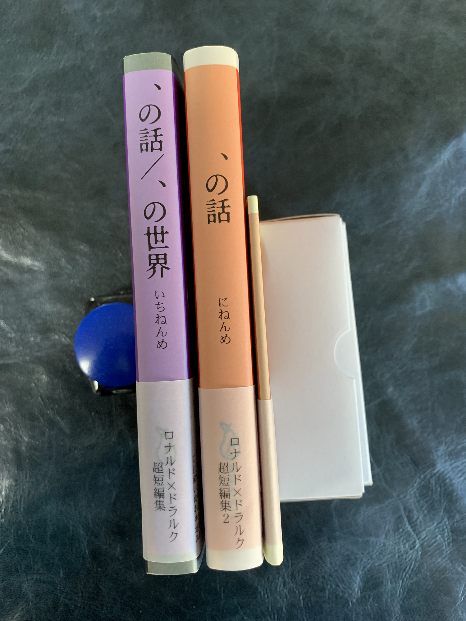 先般、スピン加工のオプションが追加されました(しかも7本まで付けられる!)。さっそくスピン加工(2本付け)を使わせていただきました。メインキャラクター2名のイメージカラーを並べています。※本はまだ製作中